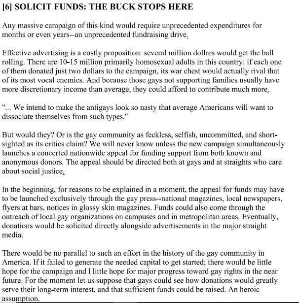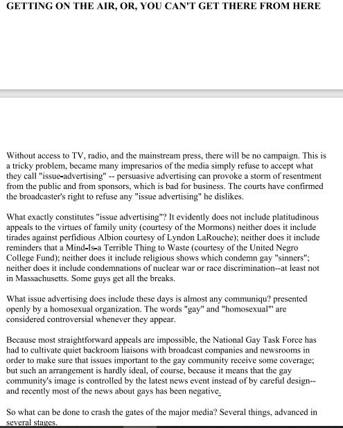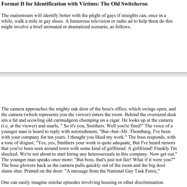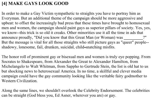 Before you say there is no gay or trans agenda, this is not 2000 or even 2010. It’s 2023 and we all know there’s an agenda because it is very out in the open. But before it was so out there that we couldn’t do anything to avoid it, it was out there in a hidden-in-plain-sight kind of way. Then in the 1980’s, in the form of a marketing campaign called The Overhauling of Straight America, which was a bullet-pointed strategy to desensitize Americans to homosexuality via any means necessary. And boy, did it work. I will add screenshots of the entire campaign at the end of this post but we’re probably not going to talk about it here unless I have to refer to it to make a point. Right now my point is just that there is an agenda. After that, I’ll add screenshots of The Homosexal Manifesto, also written around the same time as The Overhauling of Straight America, but much more graphic and disturbing. Again, I’m only adding as documentation of evidence of an agenda. Warning: Children who can read should not be within viewing distance of these screenshots.